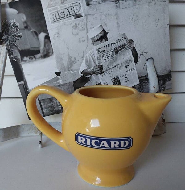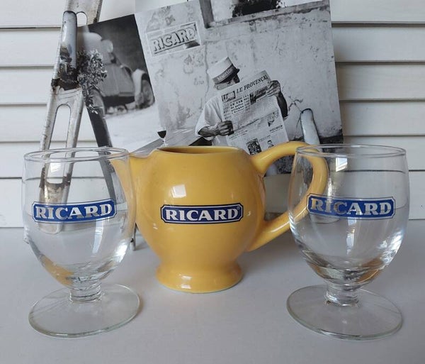 RICARD set geel aardewerk kannetje met 2 glazen