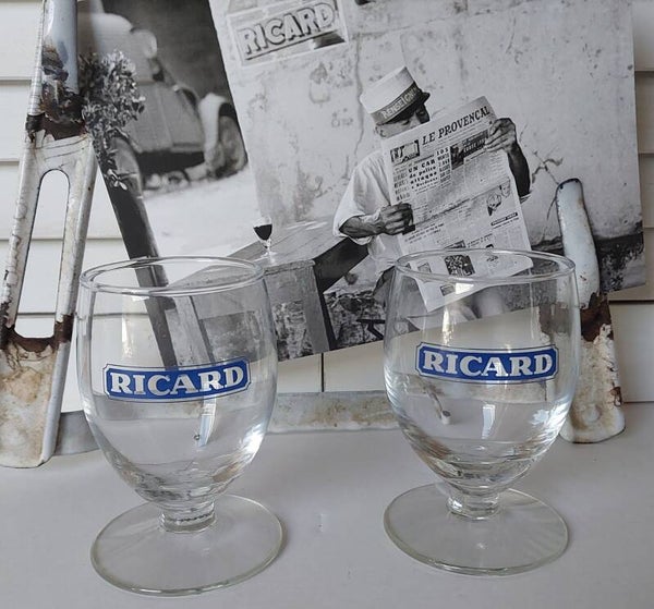 Ricard set geel aardewerk kannetje met 2 glazen (blauw)