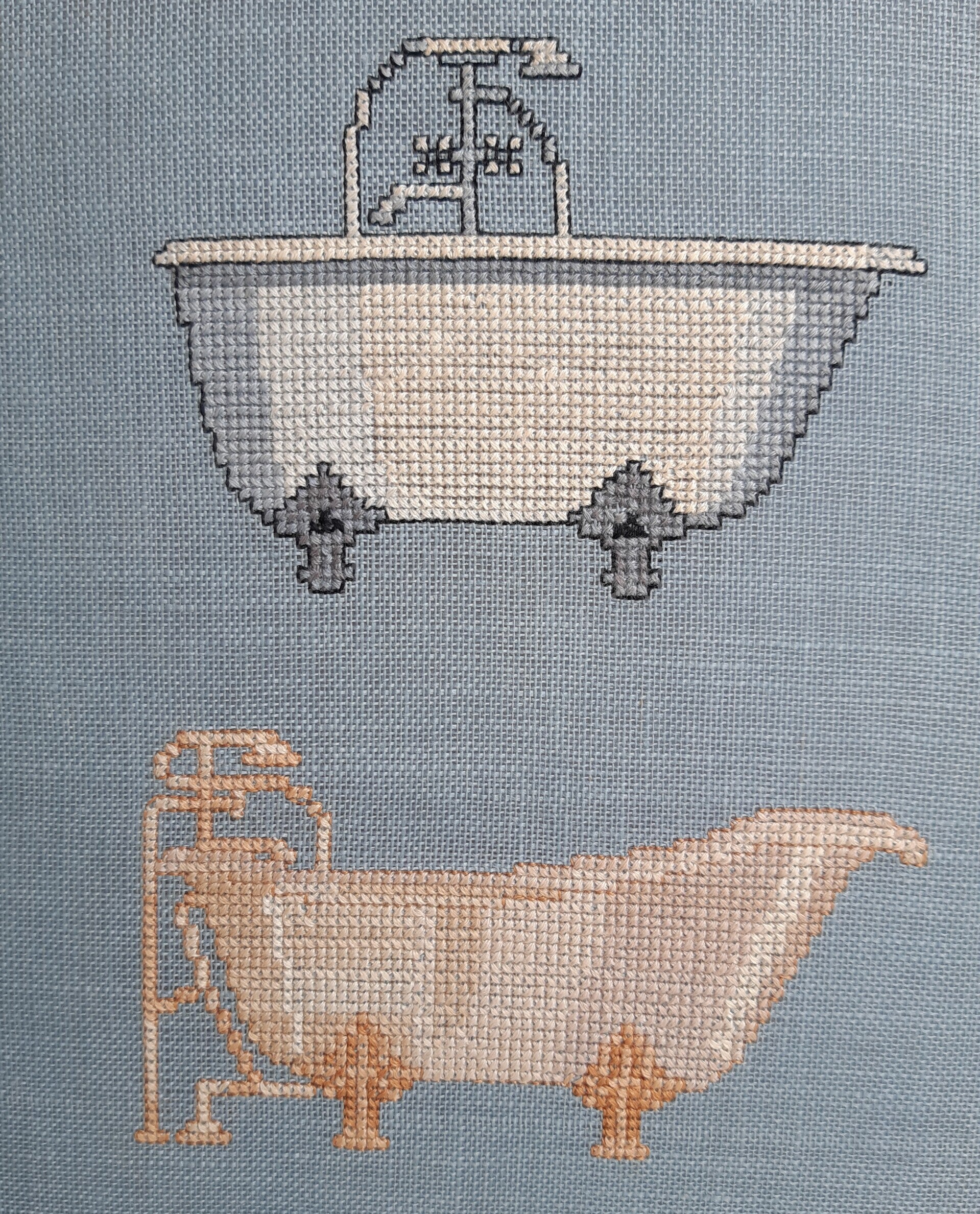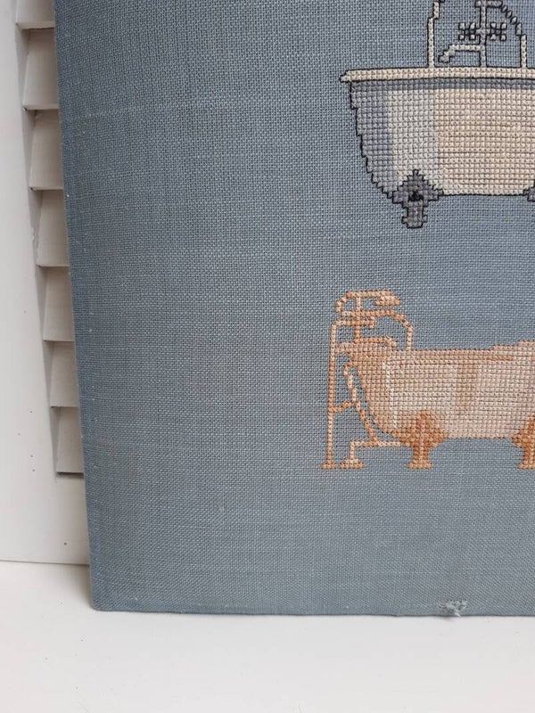 Zo mooi dit geborduurde schilderij van oude Franse baden op pootjes op prachtige vaalblauwe stof, les bains