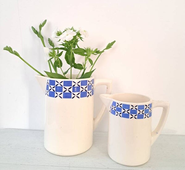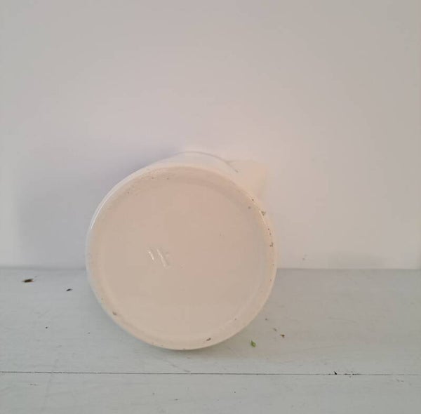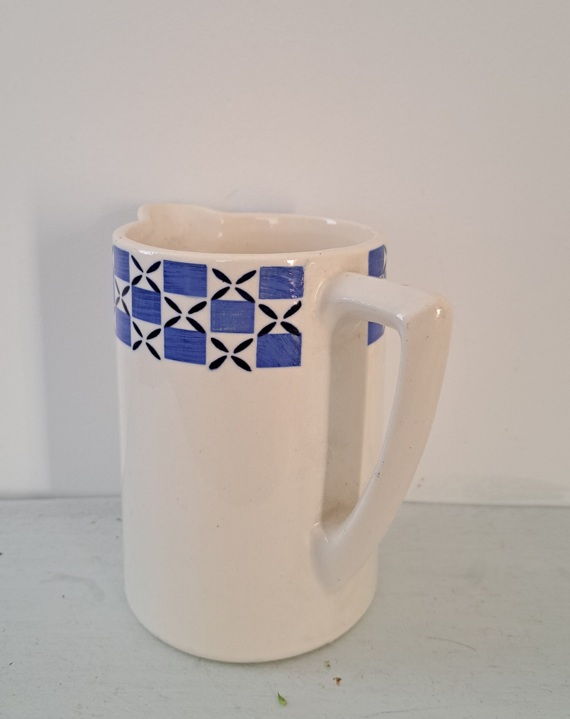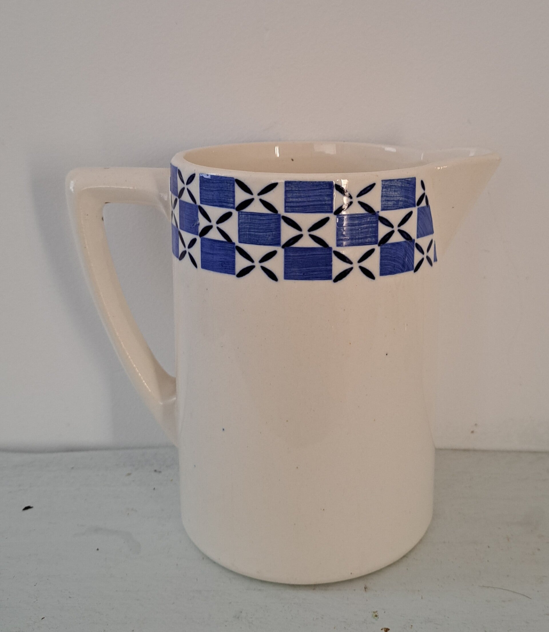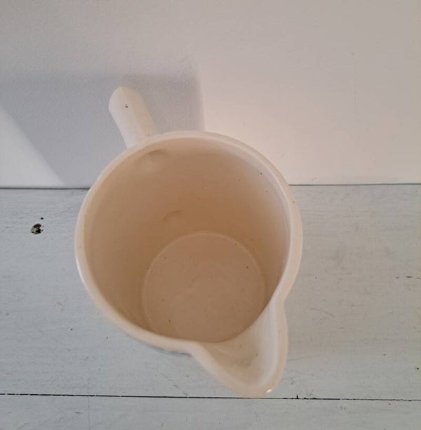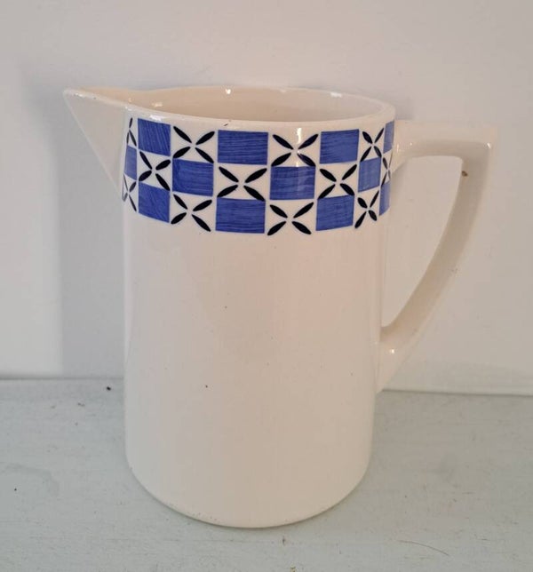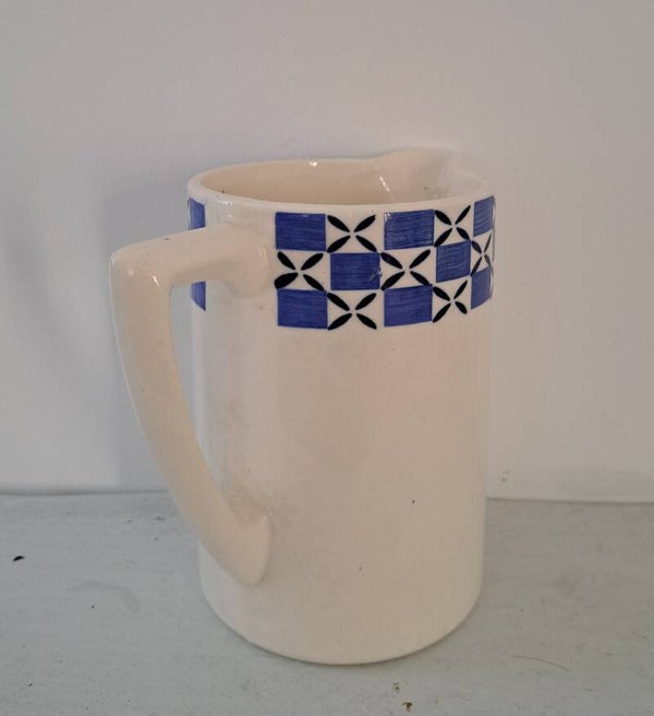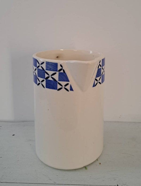 Franse aardewerk kan,wit met blauw/wit en donkerblauw motief/groot