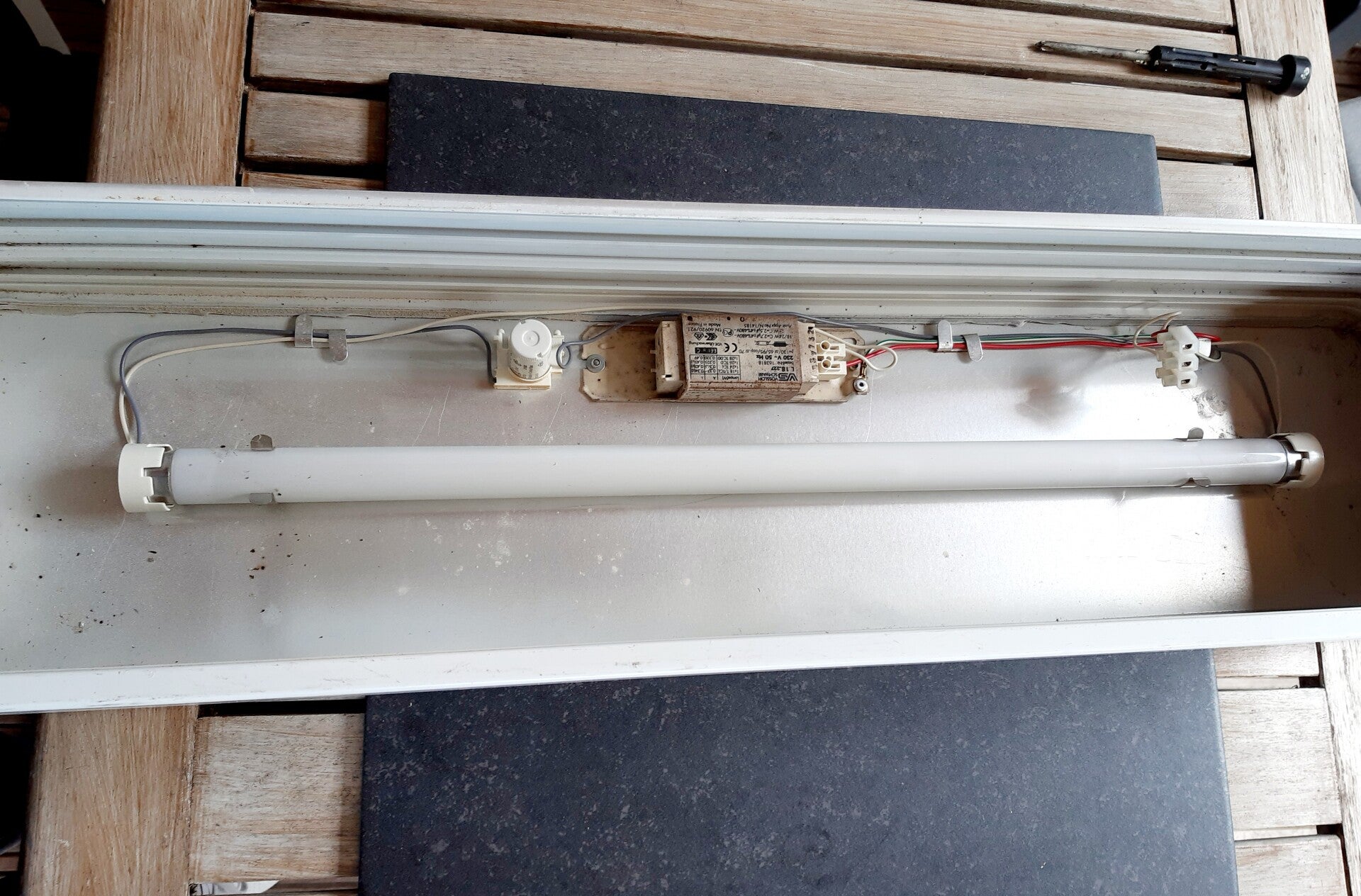 Er zit nog een elect. aansluiting en TL buis in, zie foto, maar daar geven wij geen garantie op. Volgens de verkoper kan je hem weer als echte lichtbak gebruiken, maar dat is dus geheel op eigen risico. Voor het verzenden kunnen wij de TL buis evt verwijderen of verzenden op eigen risico.(natuurlijk goed verpakt)