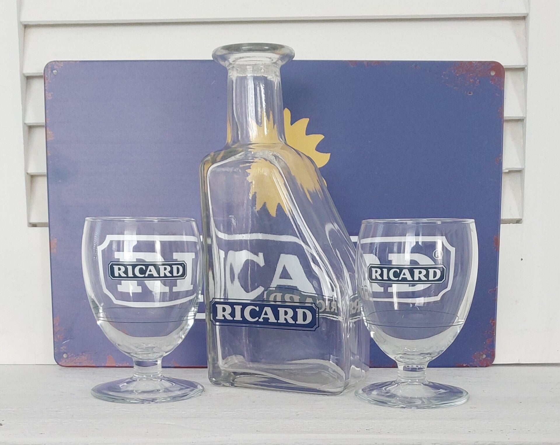 RICARD set karaf met 2 ballonglazen blauw/wit logo