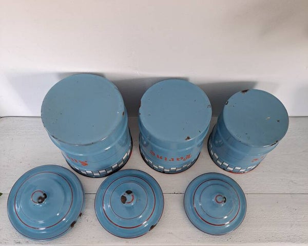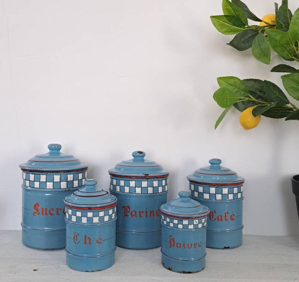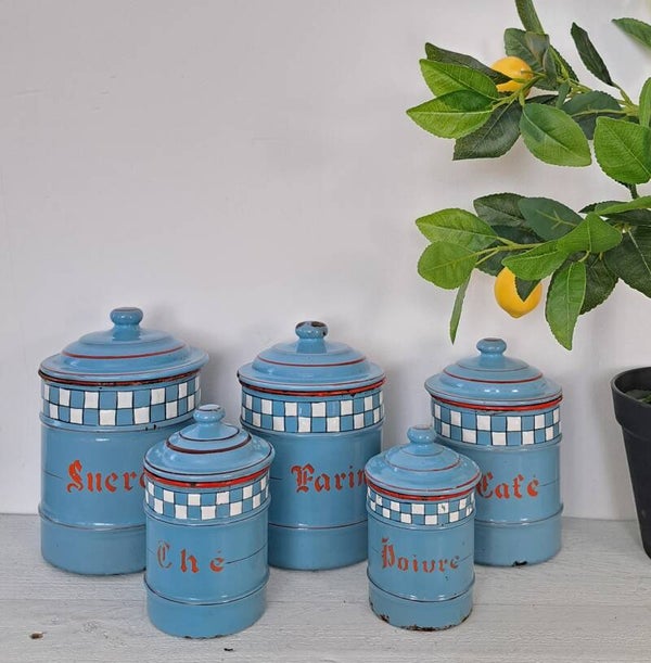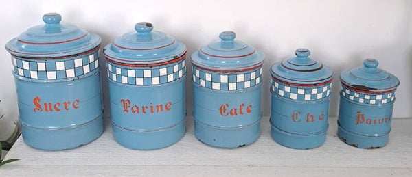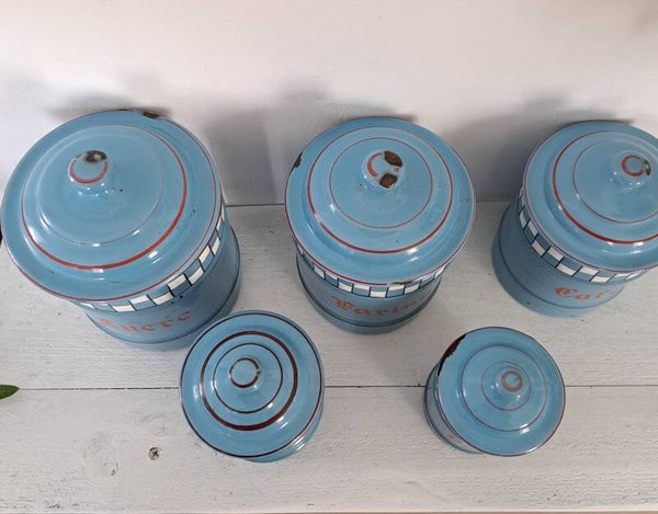 Set van 5 blauw Franse brocante emaille voorraadbussen CAFÉ SUCRE THÉ FARINE POIVRE [18126]