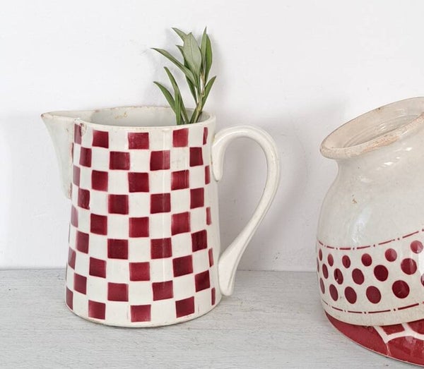 Frans aardewerk kannetje rood/wit geblokt [18126]