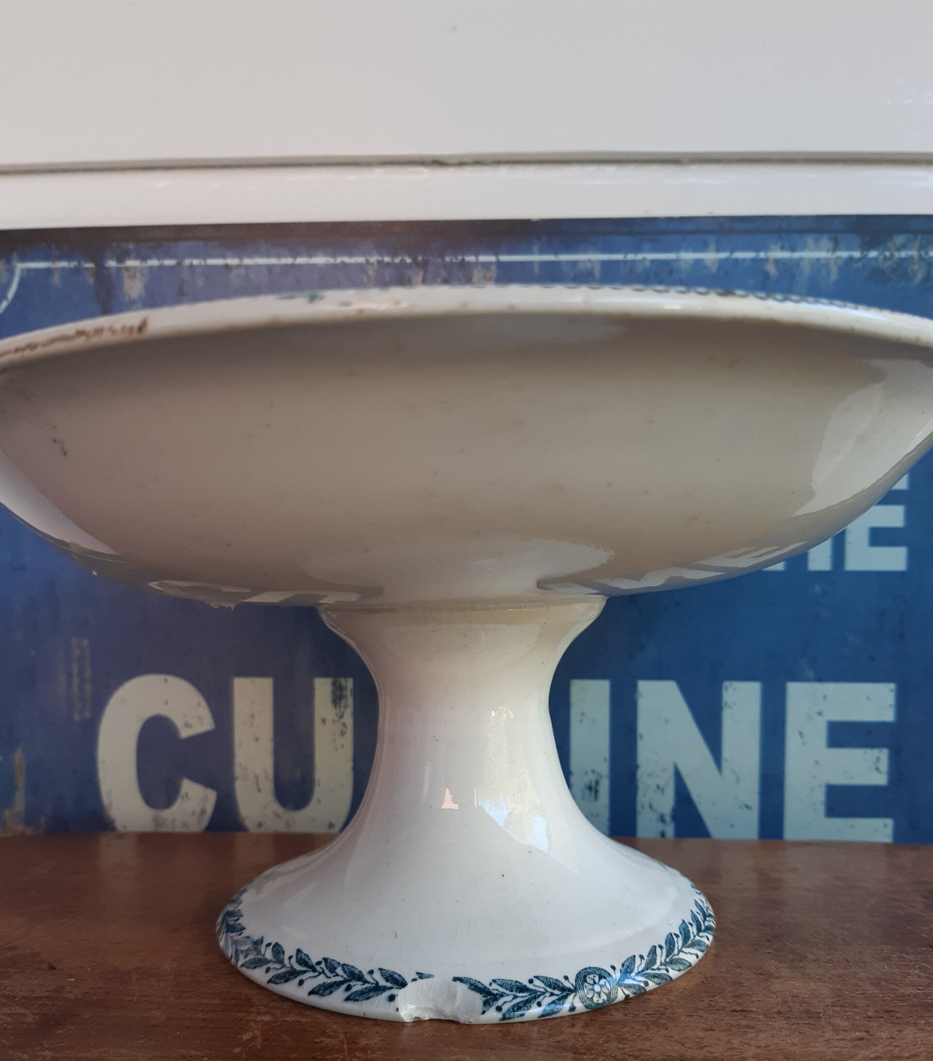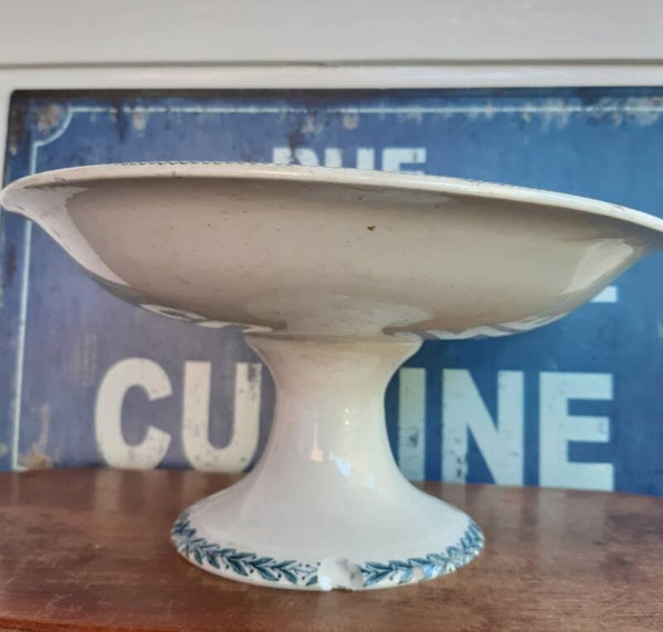 Leuke Franse Brocante schaal op voet met mooie blauwe Girlande de Lauriers versieringen langs boven en onderrand.