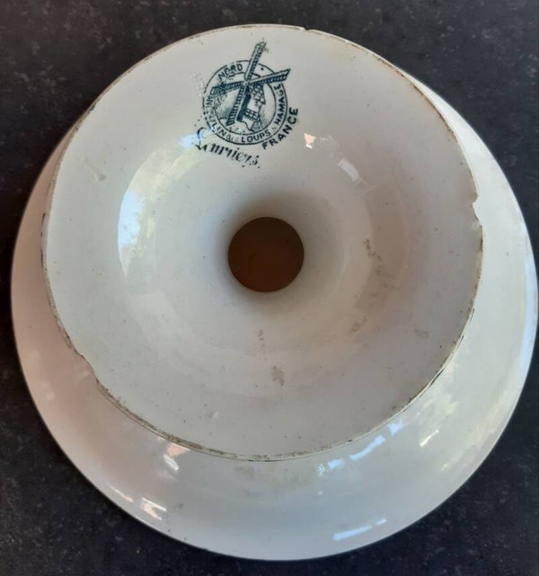 Franse Brocante schaal op voet gestempeld MOULIN DES LOUPS HAMAGE