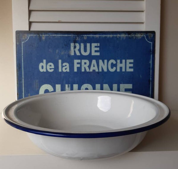 Wit emaille teil met blauw randje groot/ 32.5cm