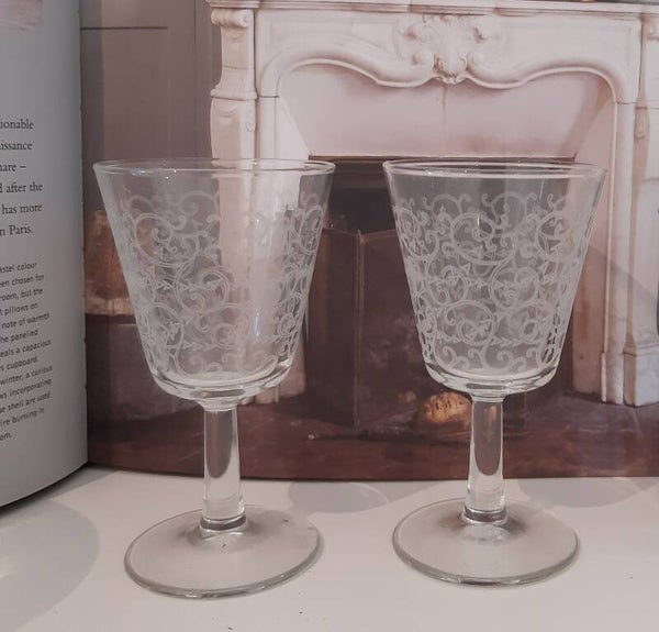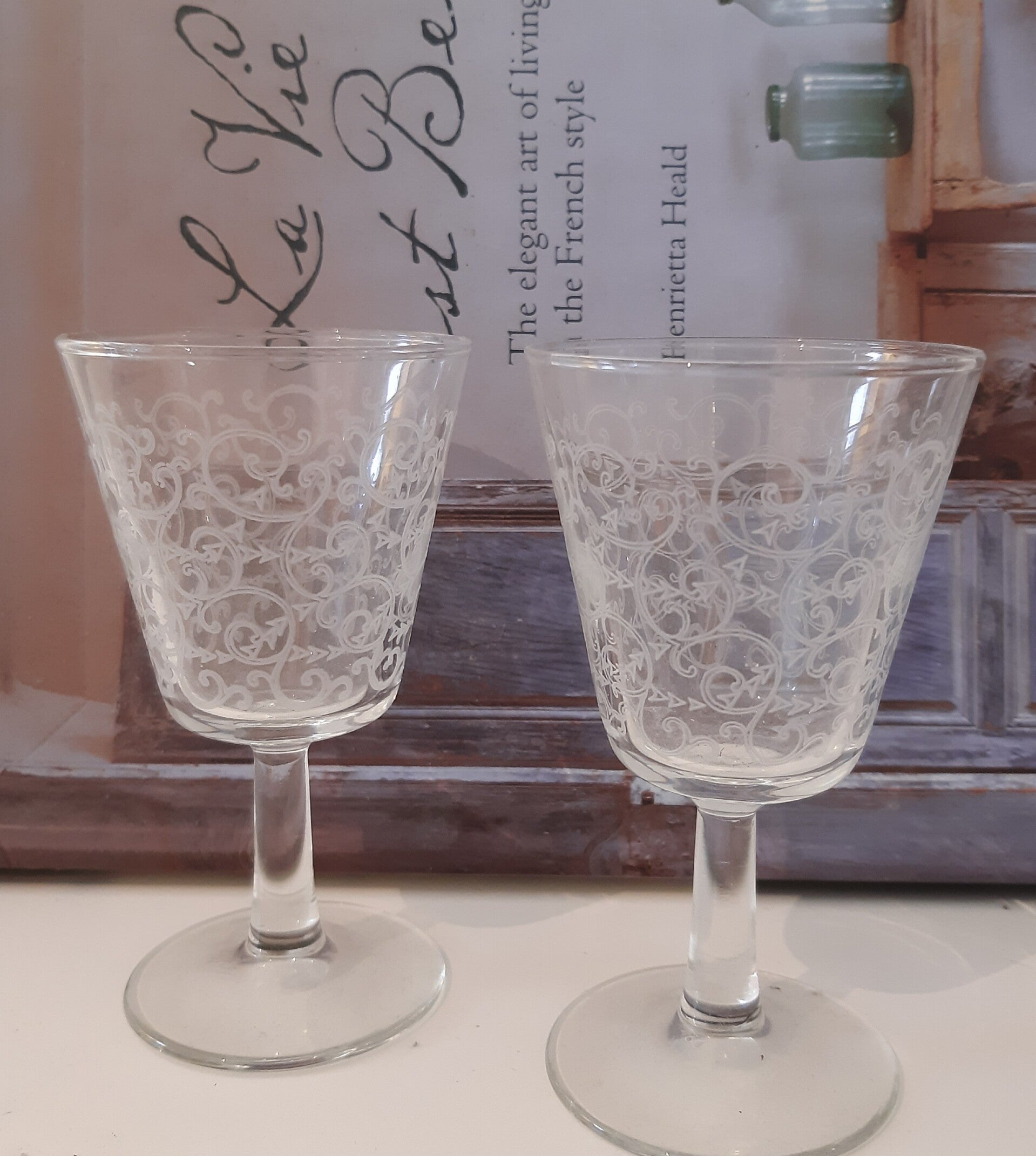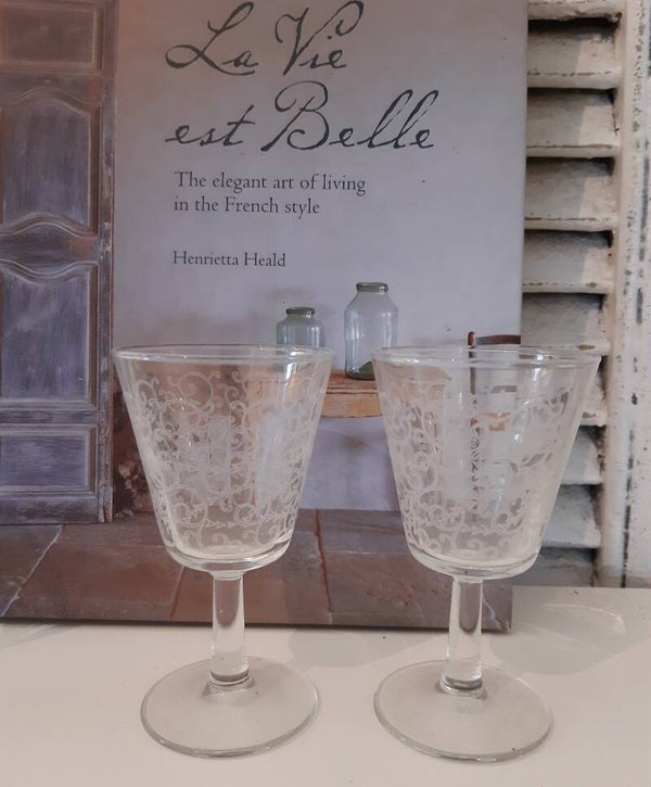 Mooie Franse likeurglaasjes met wit motief, set van 4
