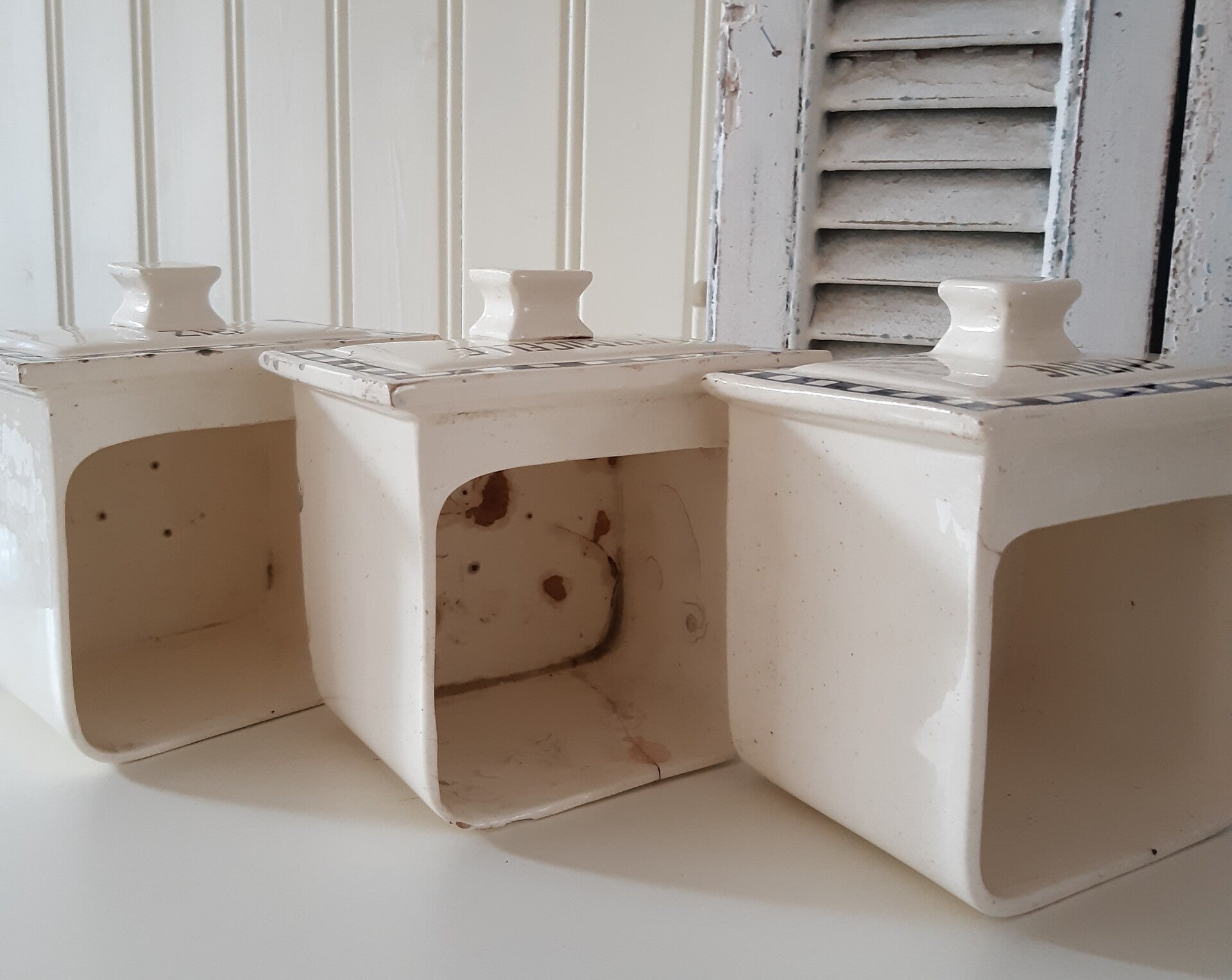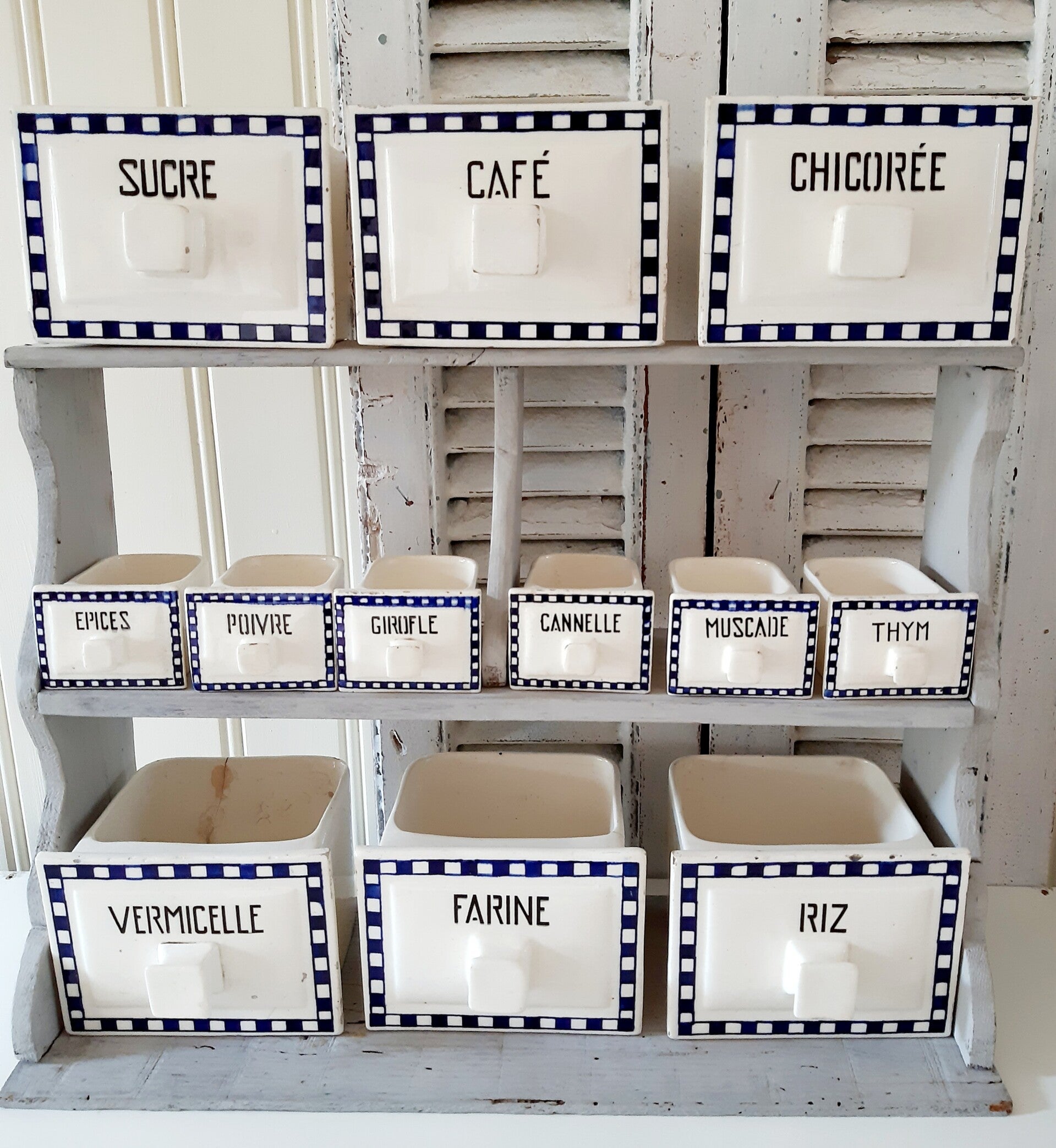 3 Franse Brocante aardewerk Kruidenrek-laatjes groot RIZ VERMICELLE FARINE
