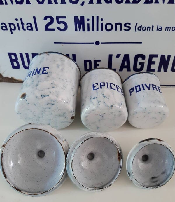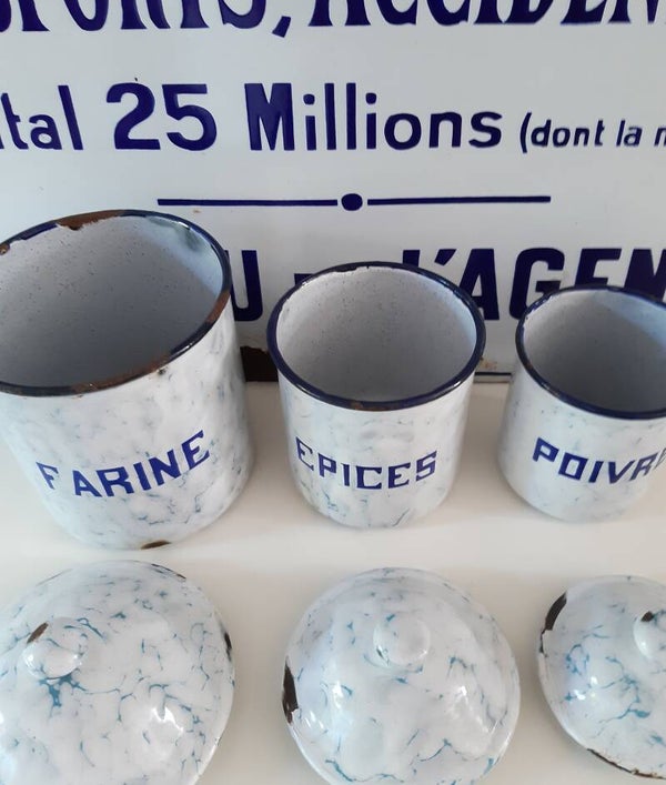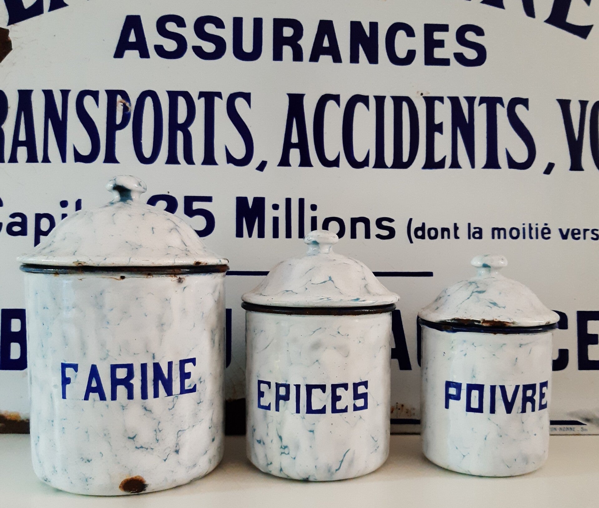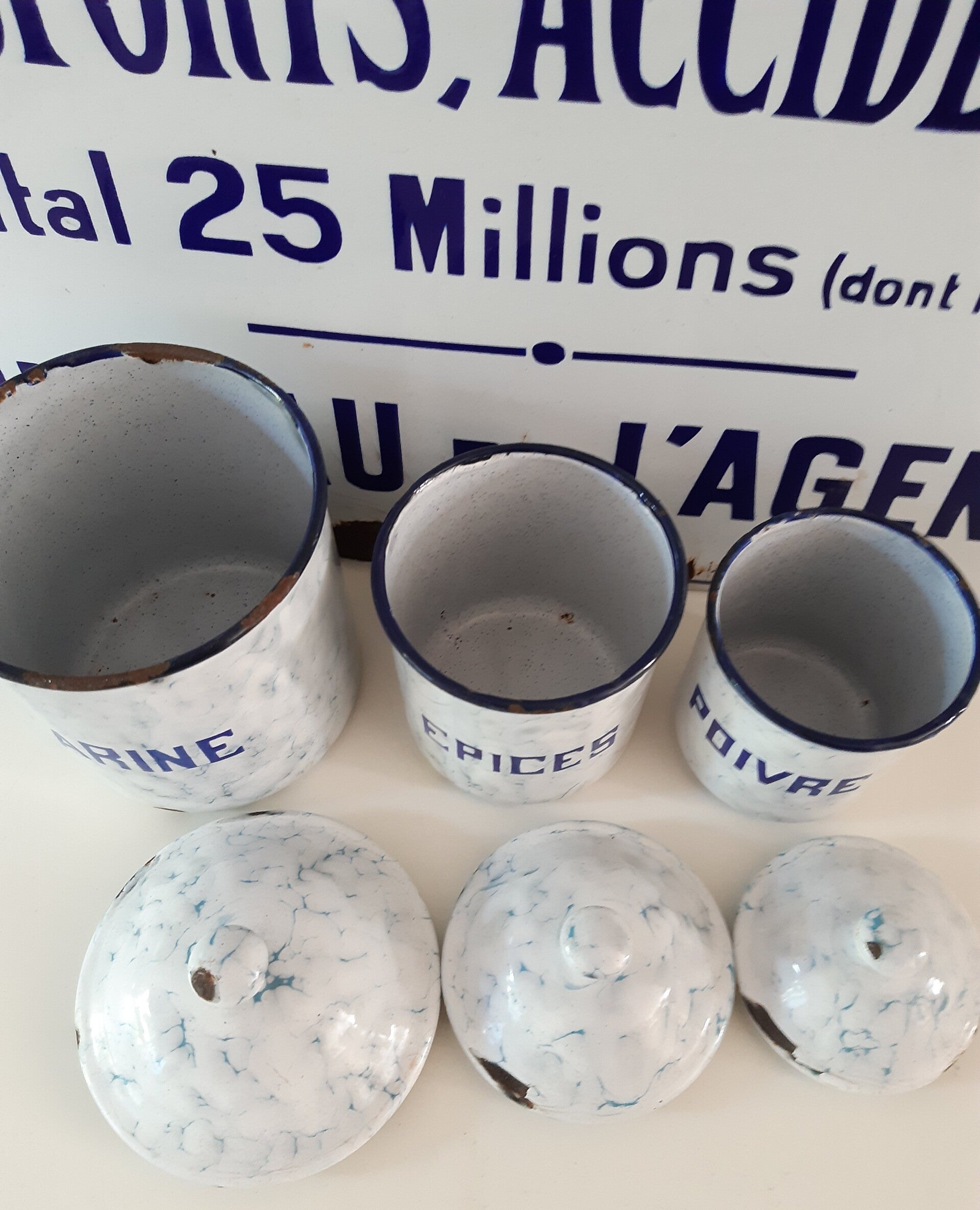 3 Franse Brocante wit emaille voorraadpotten FARINE/ EPICES/ POIVRE